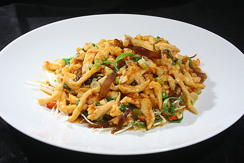 材料: 雞胸肉 200g / 黑木耳2片 / 薑末1大匙 / 蒜末1大匙 蔥花2大匙 / 荸薺 4顆 / 蔥絲200g 醃料: 太白粉1大匙 / 鹽巴 少許 / 香油(沙拉油)2小匙 / 水2大匙 調味料: 醬油2大匙 / 糖1.5大匙 / 辣椒醬1大匙 / 酒釀 1大匙 / 太白粉水 少許 作法: 首先將雞胸肉切成細絲利用醃料醃1分鐘並加入水抓一抓 這樣才能讓肉質變的更滑順~~再來將肉絲汆燙備用! 熱鍋爆香薑蒜末把調味料全放進去炒香後 最後再將材料依序放入鍋中拌炒均勻 盛盤鋪在蔥絲上就完成囉! |